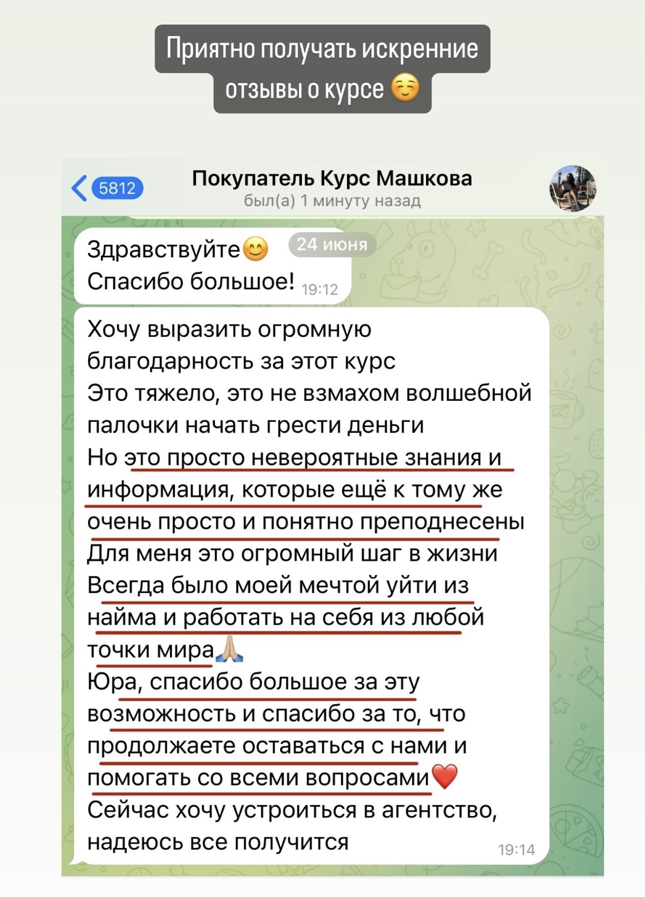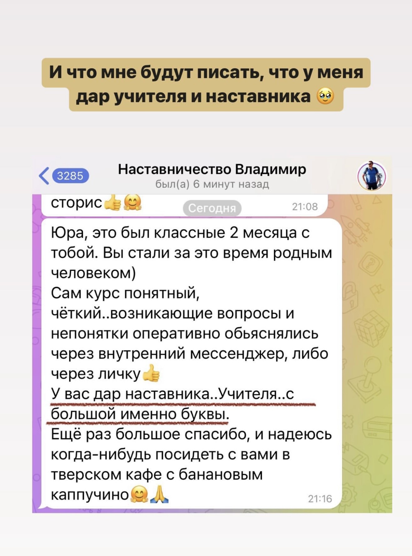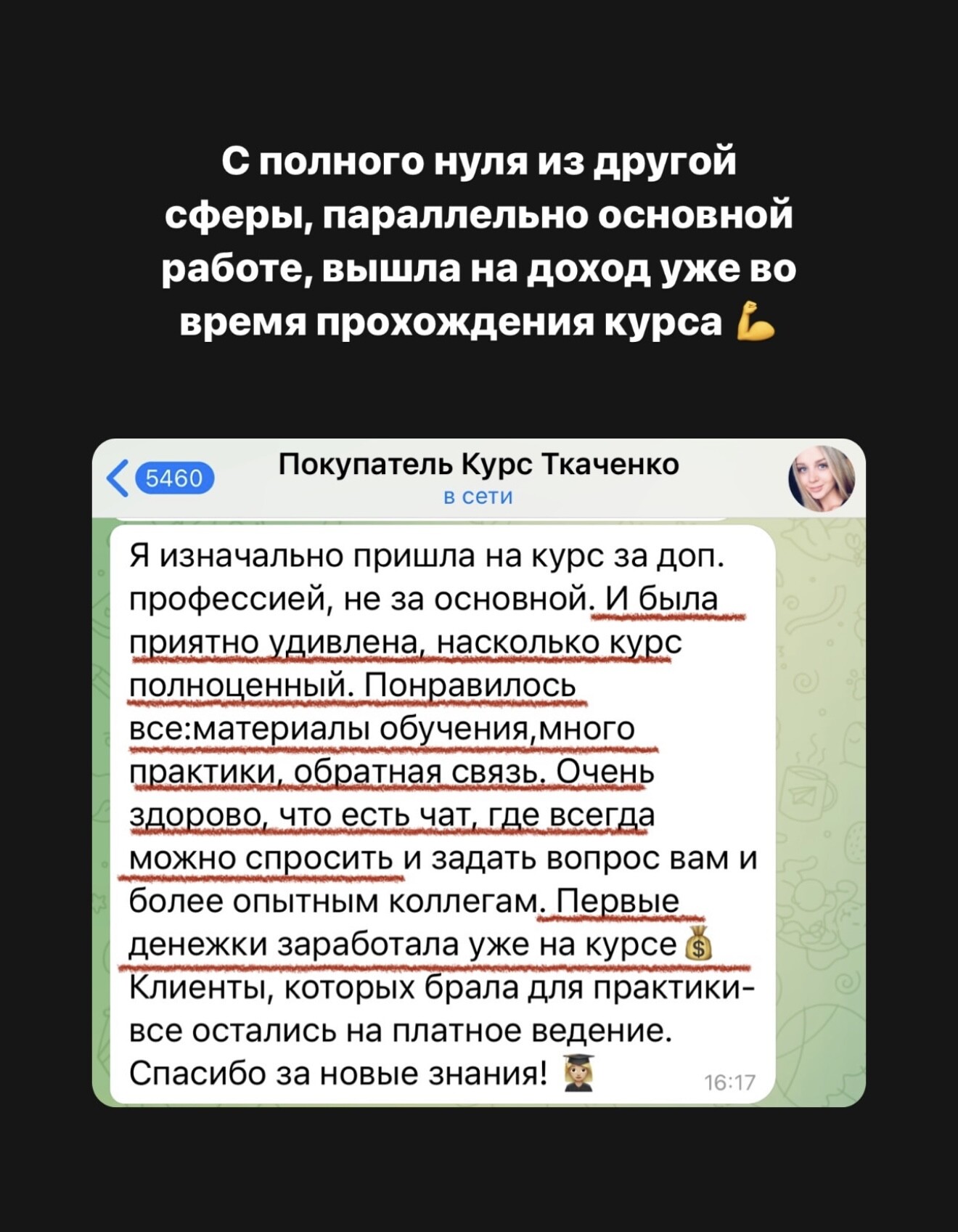 Вы не останетесь один на один с материалом. Я обеспечиваю персональную поддержку на всех этапах обучения и после его завершения, предоставляя постоянный доступ к общему чату со мной и коллегами.