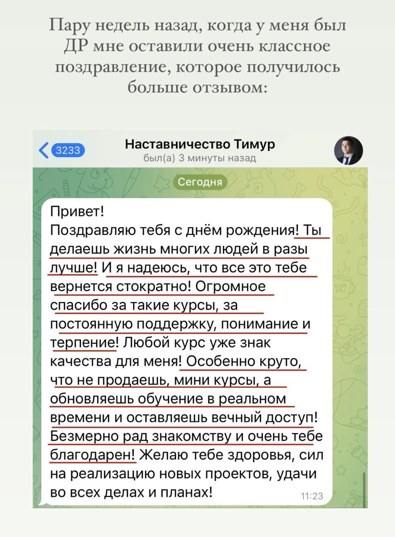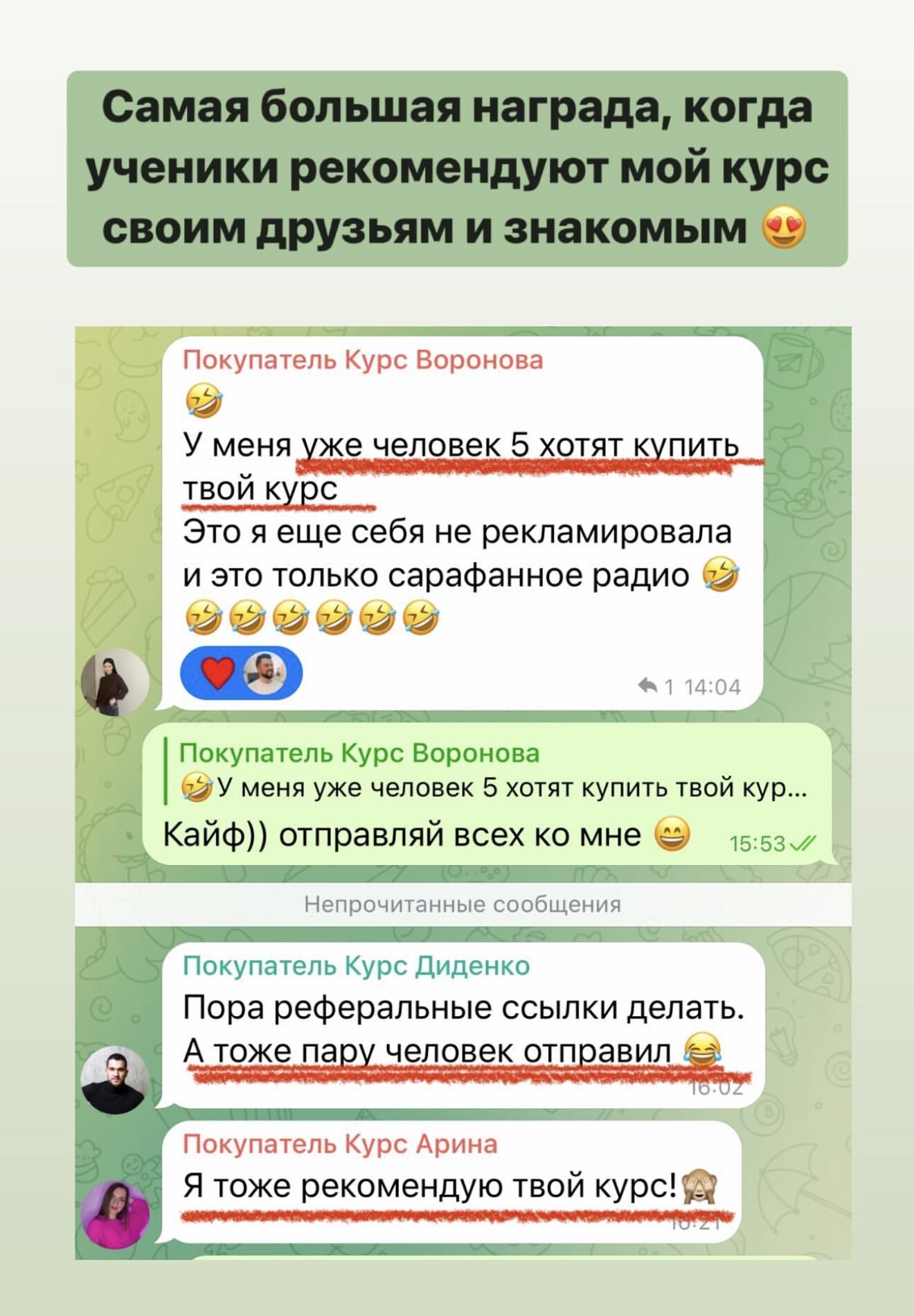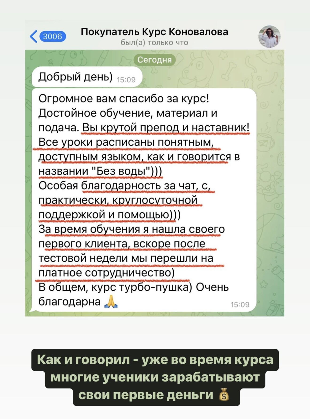 Вы не останетесь один на один с материалом. Я обеспечиваю персональную поддержку на всех этапах обучения и после его завершения, предоставляя постоянный доступ к общему чату со мной и коллегами.