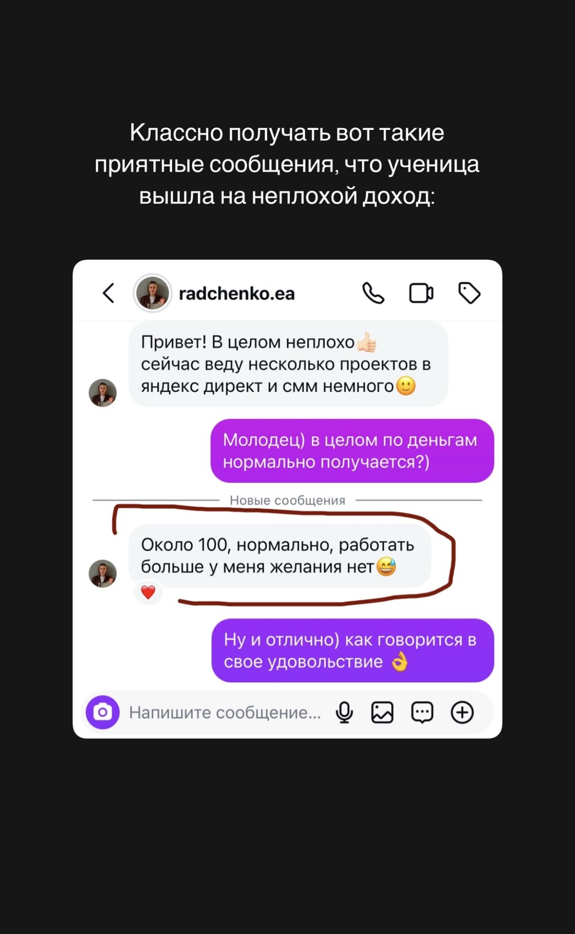 Пройдя курс, вы получите комплексные знания и практические навыки для настройки контекстной рекламы в Яндекс.Директ. Вы освоите не только технические аспекты создания и ведения рекламных кампаний, но и получите информацию, как привлекать клиентов и выстраивать с ними долгосрочное сотрудничество.Полученные знания позволят вам развиваться в сфере интернет-рекламы, работать удаленно и гибко планировать свое время, будь то путешествия, жизнь за городом или другие форматы жизни, которые становятся доступны при таком подходе.На протяжении всего обучения я буду вашим наставником: помогать со сложными вопросами, делиться опытом и советами, а также оказывать поддержку. Ну а после завершения обучения, вы останетесь в большом комьюнити коллег. Ваша готовность учиться и трудиться, плюс моя поддержка - это основа вашего прогресса в освоении востребованного навыка.