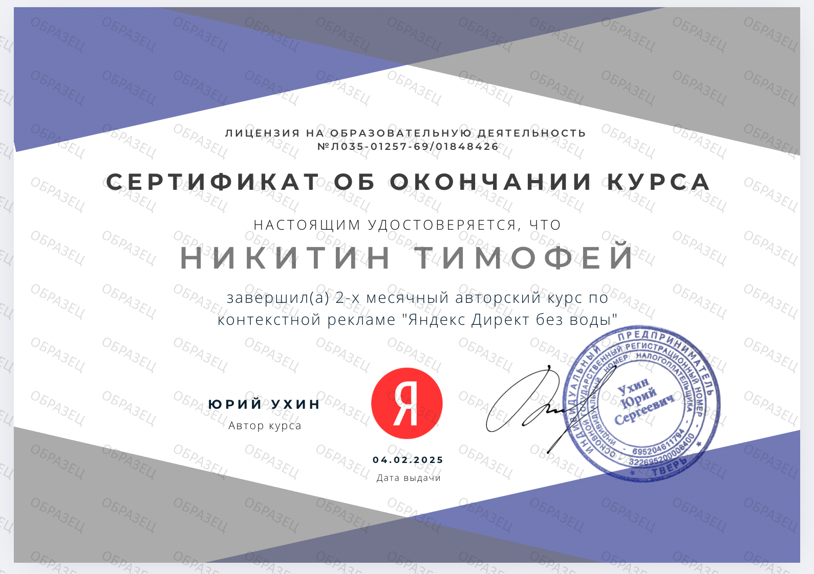Качество образовательной программы подтверждено официальной лицензией Министерства образования РФ № Л035-01257-69/01848426. Это означает, что программа курса «Яндекс.Директ без воды» соответствует государственным стандартам дополнительного образования.