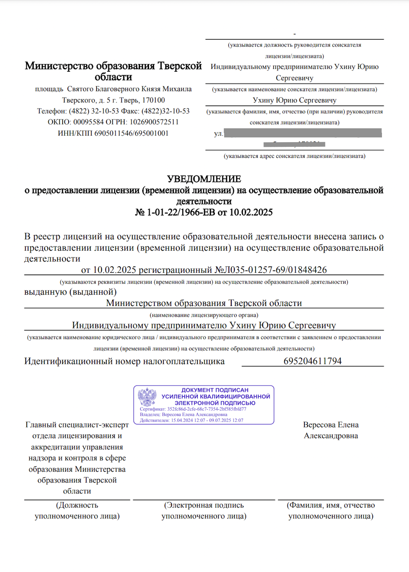 ИНН 695204611794 ОГРН 322695200006400
